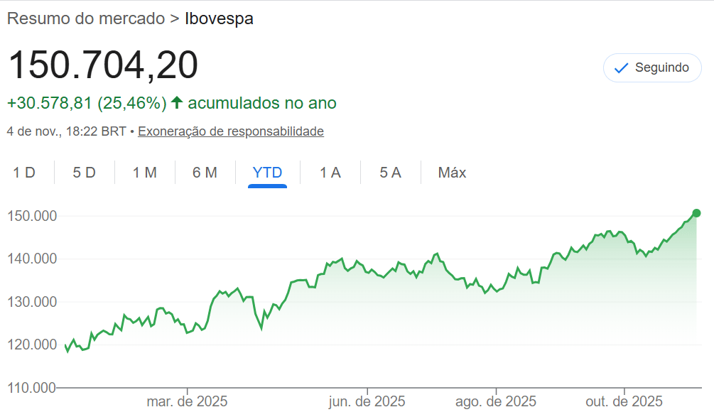 📈 Ibovespa em novo recorde: Mesmo com quedas em Wall Street, o índice brasileiro fecha acima dos 150 mil pontos e segue atraindo investidores estrangeiros.