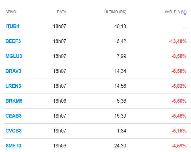 Mas nem tudo foi tragédia: aqui, Petrobras e Banco do Brasil seguraram a onda. As ações da petroleira subiram antes do balanço (que sai à noite), e o BB teve alta de 1,11%, mesmo com o resto dos bancos apanhando. Já Vale caiu 0,35%, empurrada pelo minério de ferro em queda.