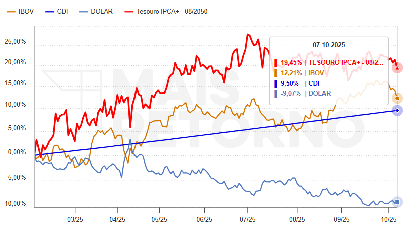 Mas o destaque vai para os títulos públicos atrelados à inflação (Tesouro IPCA+). O papel que vence em 2050 viu sua taxa cair de IPCA + 7,46% para IPCA + 7,33%. Parece pouco, mas isso fez o título se valorizar 16% em 2025.