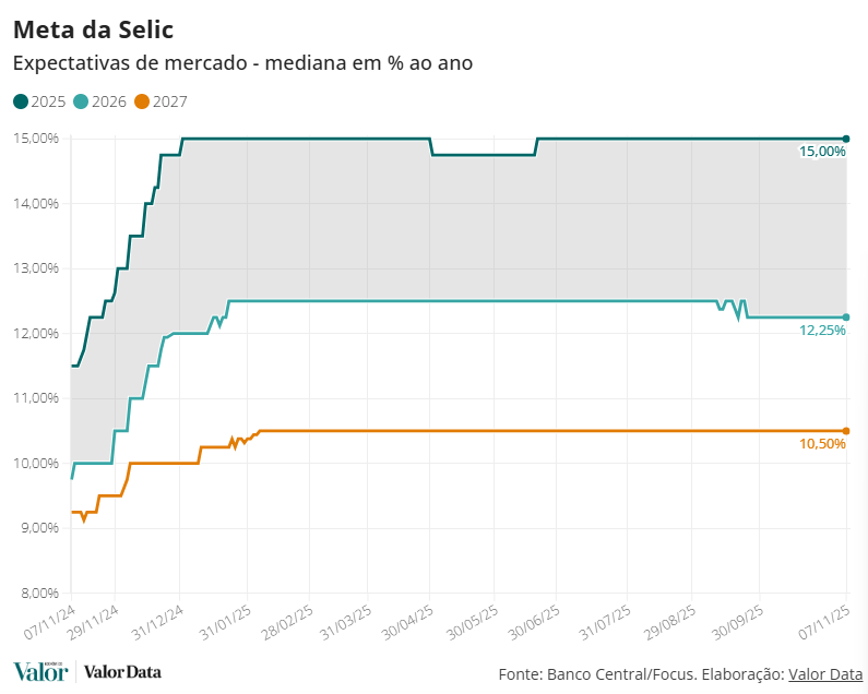 💸 Selic no fim de 2025: 15% (vigésima semana seguida no mesmo nível).