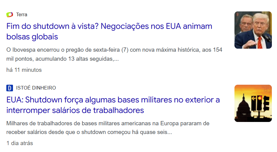 Enquanto isso, outro capítulo se desenrolava em Washington: o possível fim do “shutdown”, a paralisação da máquina pública federal americana. De acordo com as apostas, há 88% de chance de que o impasse se resolva entre os dias 12 e 15 de novembro, um salto enorme em relação aos 30% de probabilidade de ontem.