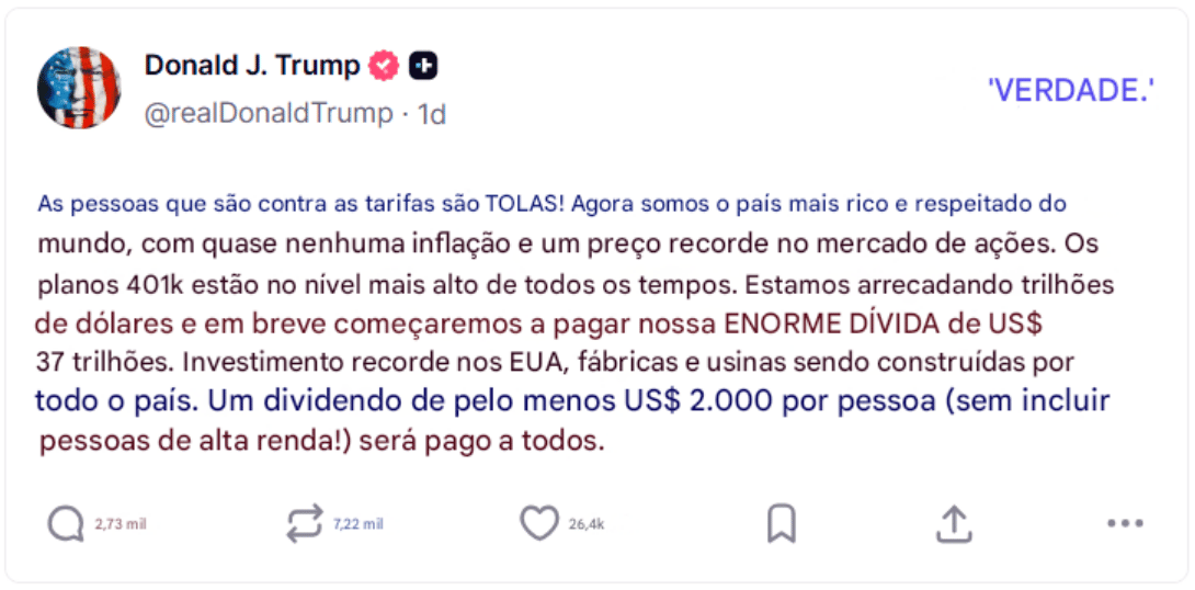 Enquanto o mercado brasileiro comemorava, Donald Trump resolveu botar gasolina no noticiário global, ou melhor, petróleo americano. Num post na sua rede Truth Social, o republicano anunciou que vai pagar US$ 2.000 (R$ 10,6 mil) pra cada americano (exceto os de alta renda) usando o dinheiro arrecadado pelas tarifas impostas a outros países.