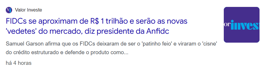 E, por aqui, o Boletim Focus trouxe um retrato da economia brasileira: inflação teimosa, juros nas alturas e crescimento de 2%. Ah, e tem novidade no crédito, os FIDCs estão quase batendo R$ 1 trilhão e virando as novas estrelas da renda fixa.